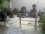 {左}梅花佛鑑塔(各務支考分骨墓) 本願寺境内の左にある。芭蕉の弟子の俳人・各務支考(かがみしこう)は僧侶を目指していたが還俗し芭蕉の門人となり俳号を獅子庵、東華坊などと称した。蕉門十哲の1人で美濃派の創始者でもあり芭蕉の死床では遺書の代筆もした。享保16年(1731)故郷の美濃国北野村(現:岐阜市山県北野)で没すると桑名の美濃派の雲裡坊杉夫(うんりぼうさんぷ)が支考の墓に参詣しやすいよう分骨を貰い受け東海道沿いの本願寺に墓を建立した。北野村に支考本人が生前に建立した本墓と同じく名に因み石は丸い鏡の形をしている。左には大正12年(1923)建立の芭蕉句碑、周りに雲裡坊から続く桑名の俳句結社「間遠社(まとうしゃ)」歴代社長の句碑10基がある。計12基の石碑のうち8基が昭和52年市史跡に指定。 |