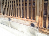 {右}馬つなぎの輪 少し先の民家(竹内家)のコンクリートの基礎上部の土台木材に黒い金具が5つ付いておりそのうち4つに鉄の輪が付いている。江戸時代の矢田村は城下外の立場で鉄輪は旅人が休息するために馬をつないだ名残とされる。木造2階建で1階には格子になっている建物は明治初期の築で矢田地区は戦災を免れたため古い町並が残る。 |