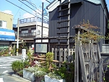 {右}矢田立場ポケットパーク しばらく行くと東海道は突き当たり左折する。その右角の黒壁の蔵を背景に火の見櫓、周辺地図付きの矢田村の説明板、矢印付き「東海道」石柱があり周りが花鉢などで飾られている。火の見櫓は平成3年に再建したもの。江戸時代の矢田村は城下外の立場で享和2年(1802)長円寺11世魯縞庵義道著の久波奈名所図会には「此立場は食物自由にして、河海の魚鱗・山野の蔬菜四時無きなし」とある。左折した福江町も立場の続きで現在は新しい町並だが江戸時代には茶店などが並び南端には旅籠の客引の詰所である宿引小屋もあった。西国からの大名などが通行の際には役人がこのあたりまで来て出迎えたと言う。 |