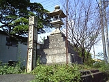 {右}妙延山 寿量寺(壽量寺) [日蓮宗] 伝馬町49 少し先にある。今一色(現:今中町周辺)にあった天台宗の妙蓮寺が前身。後に身延山久遠寺12世となった日意が天台宗の僧・法鏡だった頃に住職だった。法鏡は比叡山延暦寺に入り学頭となった後に身延山久遠寺11世日朝の弟子となり妙蓮寺も文明年間(1469-87)に改宗し慶長の町割で現在地に移った。入ってすぐの参道左のブロック塀前に江戸城の障壁画を描き帰京途中の慶長13年(1608)桑名で没した絵師・狩野光信の小さな五輪塔(高さ60cm幅18.5cm)があり昭和45年市指定文化財。他にも全て昭和41年市指定文化財の寛正4年(1463)慶安2年(1649)銅磬2枚、弘安2年(1279)日蓮真筆とされる大曼荼羅も所蔵。本堂はコンクリート造。境内左に鐘楼、右に蔵。本堂前右には明治2年(1869)仏足石もある。 |