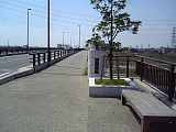 {右}伊勢神宮常夜燈(安永の常夜燈)&里程標石柱 少し先で十字路を渡るとある。堤防の上に建てられ説明立札もあり堤防の道路側にはせぎ跡が3つある。常夜燈は文化元年(1818)建立で石工は石市(現:石市商会)こと根来市蔵藤原恭備、寄進人は桑名や岐阜の材木商の連名で伊勢神宮への祈願を兼ねたものになっている。昭和46年市指定史跡。里程標は明治26年(1893)建立で「従 町屋川中央 北桑名郡」「距 三重縣廰 拾一里丗甼餘」「距 桑名郡役所丗三町余」とあり鉄枠で補強されている。向かいの堤防上には「東海道入口」と橋の絵が描かれた看板と矢印付「東海道」石柱、若い1本松があり堤防の道路側にはせぎ跡が2つある。 |