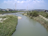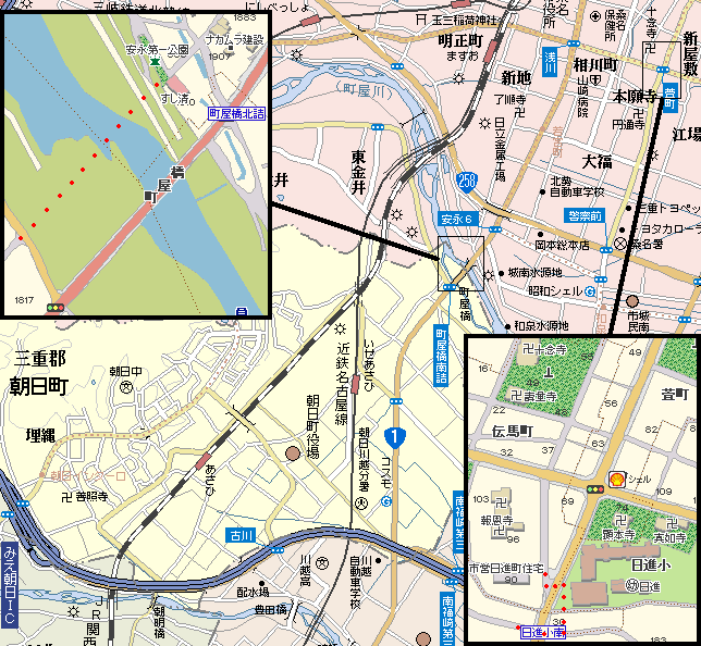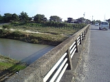 町屋川(員弁川) 橋の親柱には「町屋川」とあるが現在の正式名称は員弁川で鈴鹿山脈を水源とし長さ37km流域面積265平方kmで伊勢湾に注ぐ。町屋川は上流の旧:員弁郡と桑名の境(現:坂井橋付近)より下流の通称。周辺の河原では春日神社の石取祭の川原祓式が行われる。橋の中間地点で桑名市から三重郡朝日町に入り川を渡ると右にベンチと平成17年設置の「文学のなかの町屋川と橋」説明板があり江戸時代の作品が紹介されている。右折し町屋橋跡の対岸から東海道の続きに左折する角には「みえ歴史街道 東海道」標示板がありこの先も至る所にある。少し先で小さな橋を渡ると堤防跡の石垣があり道路両側にはせぎ跡が2つある。ここからの道はやや上りで江戸時代にはだらだら坂と呼ばれた。 |