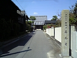 {左・寄}自栄山境智堂 顕本寺 [日蓮宗] 萱町74 少し先の交差点で県道401号に出て左折し萱町交差点で県道613号線を渡ると右にある。身延山久遠寺12世日意の開山。現在の桑名城三之丸の地にあったが慶長の町割で現在地に移った。本堂前左に昭和14年(1939)建立の大きな日蓮像があり左右に弘化2年(1845)と3年の題目塔。その左には水子観音堂もある。福島正則の家臣で寛永20年(1643)から桑名藩主・松平定綱に仕え慶安3年(1650)に没した吉村又右衛門宣充、四日市代官や山田奉行(伊勢奉行)などをつとめ寛永7年(1630)没した水谷九左衛門光勝の墓があり共に昭和41年市指定史跡。他に文政8年(1825)没の服部正啓、慶応3年(1867)没の吉村宣浚(東里翠山)、明治19年(1886)に没した服部正義などの藩の重臣の墓もある。 |