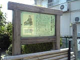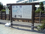 {右}朝日町説明板 少し先で近鉄名古屋線の踏切となり左には昭和4年(1929)開業の伊勢朝日駅がある。右はロータリーとなっており「古萬古発祥の地 朝日町」地図付説明板がある。右には町の木である白梅も植えられている。明治22年(1889)縄生村と埋縄村、柿村、小向村が合併して誕生した朝日村(現:朝日町)の名は壬申の乱(672)で大海人皇子(後の天武天皇)がこの辺りで朝日を拝んだという故事に由来する。町には縄生廃寺など弥生時代以降の遺跡が西部丘陵を中心に点在し日本書紀には「朝明駅」と記述されているなど歴史は古い。踏切を渡ると右には昭和13年(1938)誘致された東芝三重工場(縄生2121)がある。 |