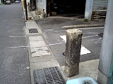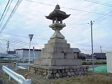 {右}里程標石柱 服部泰次郎の道標からすぐ先右の馬嶋医院(富田3-3-13)の前庭には大きな一本松がありその先の角に大正3年(1914)に県が建立した高さ239cmの里程標がある。正面に「津市 元標へ拾里 三重郡富田町」左面に「桑名郡桑名町大字桑名へ貮里貮拾町」「員辨郡大泉原村大字楚原へ四里拾参町貮拾四間」右面に「四日市市大字四日市へ壹里八町」とある。津市は三重県の県庁所在地。 |