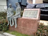 {右}サトウハチロー詩碑 中町通りが終わると近鉄富田駅口交差点で県道8号線を横断する。交差点を右折して行くと近鉄名古屋線富田駅。渡ったマンション「キャッスルハイツ富田」前に平成14年建立の詩碑がある。「わが家がある幸せよ」の歌詞が刻まれ昭和48年に大東グランドハイツ(岐阜県可児市鳩吹台)の竣工記念曲として施主の大東住宅産業(現:エイディーノウビ)の依頼で作られたもの。山下毅雄が作曲、浅田美代子が歌った。左には家族をモチーフにした銅像「幸せの像」もあり詩碑と共に同社が東海圏に展開するマンションに設置されている。サトウハチローは終戦直後のヒット曲「リンゴの唄」や童謡「ちいさい秋みつけた」などを作詞し日本作詞家協会会長、日本童謡協会会長、日本音楽著作権協会会長もつとめた。 |