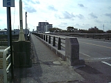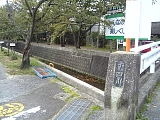 {右・寄}海蔵橋 石段を登りきった海蔵川の土手に出ると対岸に旧東海道が続いているのが見えるが橋がないため20m右の国道1号にかかる海蔵橋で迂回する。橋の両側にある歩道部分は昭和39年竣工。海蔵川は現在は「かいぞうがわ」と読むが昔は「あくらがわ」と読んだ。江戸時代には河原には刑場があり両岸には水害を防ぐため堤となっておりその上は近隣の村への道として利用されていた。川沿いの道は現在は桜並木となっており昭和31年に林時治郎が自宅前の土手に1本の桜を植えたのが起こりで3年後には近隣も協力し49本が植えられ桜並木として整備されていった。川を渡り旧東海道に戻り少し先で橋北発展会の商店街に入ってしばらく進むと道路が茶色舗装となる。 |