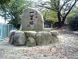 {左}三ツ谷一里塚跡(99) 少し先で海蔵川の土手に出る。土手の石段を数段登った左に小公園があり平成13年建立石碑がある。元禄3年(1690)東海道分間絵図には右に榎1本と松2本、左に松が複数あったと記録されており石段を登りきった左には絵図を掲載した平成13年設置の説明板もある。一里塚手前右には茶屋も描かれているが塚の実際の場所は少し先で昭和20年代に海蔵川が拡幅されたため現在は川となっている。小公園は八田藩の郷倉跡でその北西隣には陣屋もあった。八田藩は8代将軍吉宗に仕えた加納久通がこの地に千石の所領を得たのが起こりで享保11年(1726)に1万石を越えて藩となり文政9年(1826)藩庁が上総一宮(千葉県長生郡一宮町)に移転し一宮藩となった。小公園にはすべり台、鉄棒もある。 |