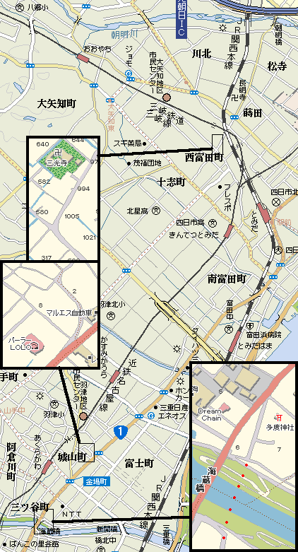{右}八田の常夜燈(羽津の常夜燈)・米洗川 少し先で県道64号線(旧:富田山城有料道路)の高架をくぐると自動車販売店や金属工場地帯となり四日市自動車検査場(八田3-7-41)を過ぎるとある。明治35年(1902)建立で竿の部分には「大神宮」と刻まれている。常夜燈のすぐ先には米洗川(よないがわ)が流れる。朝明川や十四川と同じく米洗川にも壬申の乱(672)での大海人皇子(後の天武天皇)の伊勢神宮遥拝の伝説があり戦勝祈願に供える米を洗った、或いは供える酒を造るための米を洗ったと伝わる。八田は江戸時代は八幡村と言い明治22年(1889)に他の周辺の複数の村と合併し羽津(はづ)村となった。米洗川に架かった米洗橋を渡ると工場地帯が終わる。 |