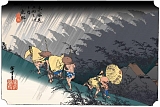 {右}「東海道 庄野宿」石柱 しばらく国道1号を進むと右に中日本コンクリート工業(日本コンクリート工業鈴鹿工場)(庄野町1900)があり工場を過ぎた庄野町北交差点で東海道は右折する。交差点には「庄野宿資料館」矢印標示もある。しばらく下り坂を進み次の信号を左折した角の空地に石柱と庄野宿の屋根付の説明板がある。石柱は平成12年建立で庄野小学校(庄野東2-5-35)の旧:門柱を流用したもの。説明板には「東海道宿場・伝馬制度400周年記念事業」と書かれ広重の絵も掲載されている。にわか雨に坂を走り急ぐ人物を描いた「庄野の白雨」は広重の作品の中でも傑作とされる。東海道はここから庄野宿へ入って行く。 |