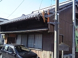 {右}問屋場跡 少し先の民家の軒下の壁に立札風の説明板がある。幕末の頃にはここに問屋場があり明治5年(1872)に廃止された。問屋場には問屋2名、年寄4名、帳付4名、人馬差8名が半数ずつ交替で詰めており問屋役は森家、小林家などがつとめた。宿場の経営が厳しかったため幕府は定められていた人足百人伝馬百疋を宝暦8年(1758)には人足30人伝馬20疋とした。文化12年(1815)には石薬師宿に合わせ人足50人伝馬50疋としている。宝永4年(1707)人馬賃金の値上げに関する高札も現存し庄野宿資料館に展示されている。広重の行書版東海道の庄野宿は問屋場の様子を描いている。 |