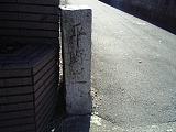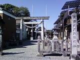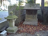 {左}シャングリさんの祠 少し先の県道28号線(旧:国道1号)に合流する手前の2叉路で右に入り少し行くと左から来る県道41号線に合流する。合流点右には「東海道」標識もある。合流点手前左のブロック塀内側には木製鳥居とコンクリート屋根に木扉の祠があり地元ではシャングリさん(サングリさん)と呼ばれている。通行人による悪疫から子供を守るために安置されたもので東海道分間延絵図には「叉具神」とある。祠左前には竿部分が折れ修復された慶応元年(1865)灯籠があり左にその灯籠の竿の古い残骸「丑 八月」や東の鈴鹿川対岸の現在の鈴鹿市国府町への道標の残骸「こふ」が転がっている。 |