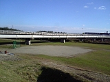 {右}「東海道 庄野宿」石柱 その先の十字路にある。庄野宿の入口にあった「東海道 庄野宿」石柱と同じく庄野小学校(庄野東2-5-35)の旧:門柱を流用し平成12年に建立された。この付近が庄野宿の出口にあたる。しばらく進むと左後ろから道が合流しそのまま右歩道を歩いて行くと市道庄野汲川原線の高架がある汲川原交差点で国道1号に合流する。東海道は国道に対し斜めに交差しているため高架をくぐり横断歩道で国道左側に横断する。横断すると左の今村ゴム(汲川原町337-1)の左側に東海道の続きが見えるがガードレールと雑草で分断されているため国道の左側歩道を少し進み左折して迂回する。 |