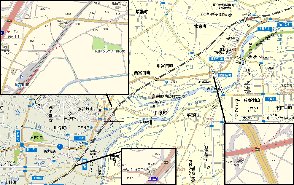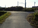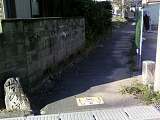 消滅した東海道 東海道は地福寺前の2叉路を左に進み坂を下ると県道641号線に出る。横断歩道はないがそのまま直進し県道と斜めに交差して反対側に続くのが東海道で手前の植え込み左には手書きの道案内がある。渡って住宅街をしばらく進むと突当りとなり鈴鹿市から亀山市井田川町に入る。東海道は本来はまっすぐ進みJR関西本線の線路の反対側に続くが道が消滅しているため右折して井田川踏切で線路を渡りすぐ左折し少し先で右へカーブするところで復帰する。右カーブして少し進むと突当りで右から来る先ほどの県道に合流し左折する。少し先右の細い路地の角にはコンクリート祠に安置された地蔵があるが風化し丸い石になっている。 |