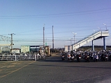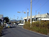 国道1号交差点 道なりにしばらく進むと国道1号に交差するが横断歩道がないため右の川合歩道橋で渡る。歩道橋の床面には蝋燭を背負った亀の絵のタイルが何枚かあり亀山市は蝋燭で有名なカメヤマの創業地として知られる。渡って少し先の十字路を左折するのが東海道。十字路には谷口法悦題目塔への方角を示す「法悦題目塔」標示もあり江戸時代にはこの角には高札があった。本来の東海道は国道1号に出たあたりで左に沿っている川を左折して渡り右折して川の左側を進み高札のところで左折していた。 |