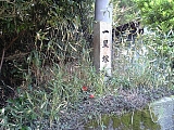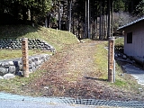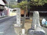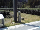 {左}梅屋本陣跡 茶畑を過ぎると鈴鹿川の支流の若妻川に架かる中乃橋の手前に昭和51年石柱がある。建坪161坪(532平方m)。嘉永3年(1850)頃の町並図では大竹屋本陣から1軒おいた隣で梅屋孫九郎とある。石柱手前には「東海道松並木復元第一号」木柱があるが松はなく小さな切株がある。 |