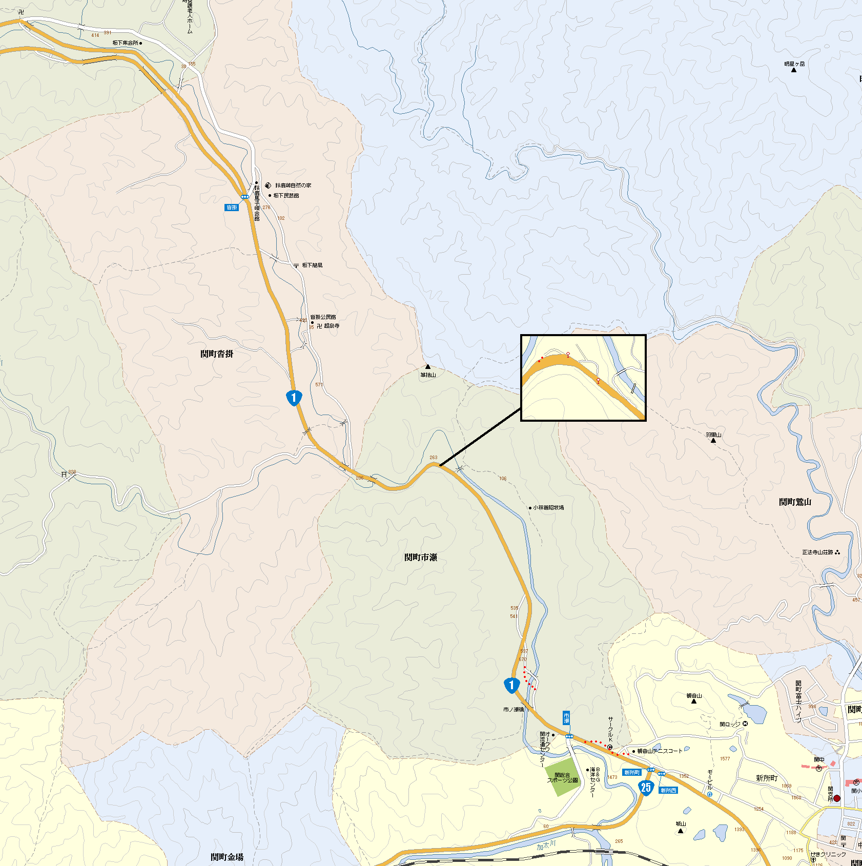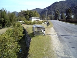 {右}鈴鹿峠自然の家(坂下青少年研修センター) 関町沓掛123 斜め向かい。昭和13年(1938)坂下尋常高等小学校(後の坂下小学校)の校舎として建てられた建物で昭和54年廃校後は公民館を経て青少年向け宿泊研修施設となった。中庭を挟んだ校舎2棟を屋根付き廊下で繋いだ木造平屋建瓦葺の建物で平成11年国登録有形文化財。敷地内には地域の歴史民俗資料を展示した坂下民芸館、プール、グラウンド、炊事棟もある。先に進むと少し先で左後ろから道が合流しここに「三条大橋」木柱がある。左の鈴鹿馬子唄会館駐車場内には広重の絵。しばらく何もない道を進むと河原谷橋で鈴鹿川の支流である河原谷川を渡る。下乃橋とも呼ばれ渡ると坂下宿に入る。 |