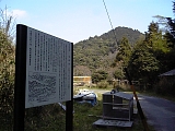 {右}「名勝 筆捨山」説明板 しばらく国道を進んで行き右に下っていく分岐を過ぎるとその先で東海道は国道から右に分岐する。分岐した左に平成19年設置の説明板がある。正面の鈴鹿川対岸に見える山が筆捨山(標高289m)で楽岩と砂岩によって出来ており本来は岩根山と言った。室町時代に画聖と言われた狩野元信が山を描こうとしたが描けずに諦め途中で筆を捨てたことから筆捨山と呼ばれ東海道名所図会にもその由来が記載されている。諦めた理由はあまりにも美しい景色だったとも付近の天候が頻繁に変わったとも奇岩の岩肌が多かったからとも言われる。広重は保永堂版、狂歌入、行書版など殆どの五十三次の坂下宿の絵で筆捨山を題材にしている。山は昭和53年市指定名勝。 |