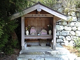 {右}身代地蔵尊 旧道の名残が再び車道に合流した少し先の石垣の下にある。祠の中に1体の石地蔵と風化した石が複数安置されている。大名行列を横切り処罰されかけた子供の身代わりとなったと伝わる。地蔵尊すぐ先で鈴鹿川の支流の如来堂川に架かる如来堂橋を渡る。上乃橋とも呼ばれ渡ると坂下宿が終わる。少し先右の土蔵と民家の間に3体の石地蔵と風化した五輪塔2基があり櫛屋の地蔵と呼ばれる。旧坂下宿にあったが明治以降に移された。民家が移転する際に夢に現れ「わしも一緒に連れてってくれ」と言ったと伝わる。民家左には井戸跡もある。少し進むと鈴鹿川の支流のへノ字谷川を渡る。しばらく行くと右に比較的新しい等身大の老爺と老婆の像がある。 |