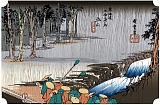 土山宿 本陣2脇本陣0旅籠44家数351人口1505[天保14年(1843)] 平安時代から鈴鹿峠を控えた宿駅として発達してきた。江戸時代には雨が多いとされ「坂は照る照る 鈴鹿は曇る あいの土山 雨が降る」と鈴鹿馬子唄に唄われたり広重も雨の情景を描いている。田村川板橋から松尾川(野洲川)まで25町55間(2.5km)の細長い宿場町は東海道を挟んで田村神社を鎮守とする北土山村と白川神社を鎮守とする南土山村に分かれ両村で宿場を運営していた。もと一村であったが永享12年(1440)に街道を境に分村したと言う。平成16年に水口町、甲賀町、甲南町、信楽町と合併し甲賀郡土山町から甲賀市土山町となり現在も古い建物を中心に町並が整備され面影を残している。 |