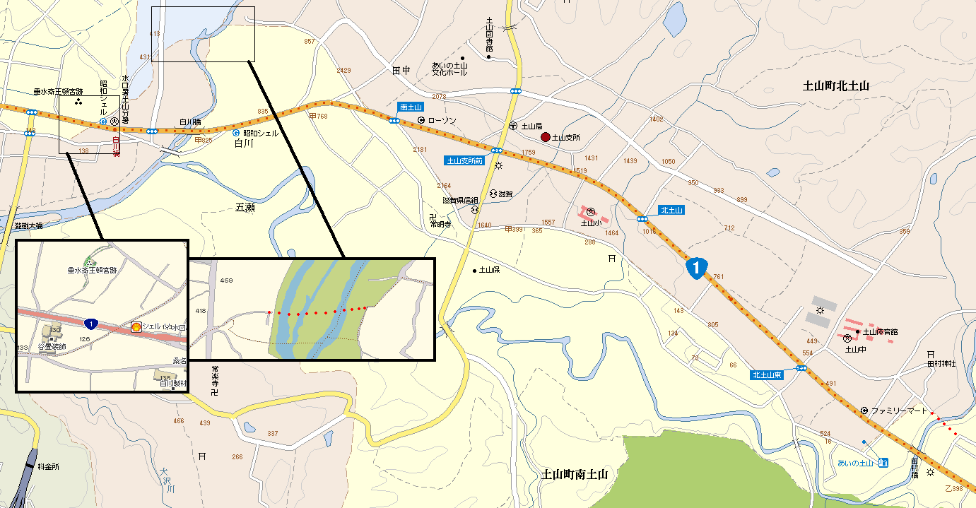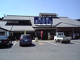 {右}道の駅 あいの土山 土山町北土山2900 向かいが駐車場で奥に建物がある。平成5年から登録が始まった全国の道の駅のうち第1回に登録された全国103箇所のうちの1つ。建物内では土山茶やかにが坂飴、毬饅頭など土山の名産品も販売。休憩スペースもあり土山茶の無料サービスもある。土山は県内一のお茶所で文和5年(1356)常明寺の鈍翁了愚が龍寶山大徳寺[臨済宗大徳寺派](京都市北区紫野大徳寺町53)から持ち帰った種を寺で栽培したのが起源とされる。9時-18時無休。右には野菜等を直売するやまなみ館土山宿も併設。駐車場右端には斎王群行、鈴鹿馬子唄全国大会などの大きな紹介看板、 国道沿いには甲賀市コミュニティバスの田村神社バス停もある。東海道は道の駅を回りこむように右折しカラー舗装された道を進む。