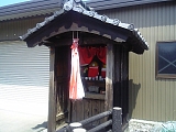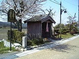 {右}一里山地蔵堂 右に道が分岐する角を過ぎると綾戸燃料住設(南土山121)の別棟手前にある。堂は昭和45年築でカラフルに彩色された半浮彫の地蔵2体が安置されている。手前角の左には「木綿屋」屋号札の民家があり「歴史の道 東海道」金属製立札もある。少し進むと右に平成3年建立「土山宿 旅籠 大槌屋跡」石柱がある。この先にも旅籠跡には石柱が建てられている。 |