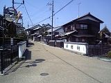 {右}問屋宅跡 少し先の1階が格子、2階が白壁で間口が広い大きな建物左前に平成13年建立の「土山宿 問屋宅跡」石柱と平成14年設置の説明立札がある。問屋場の責任者である問屋役を務めていた家で「土山宿 油佐」屋号札がある。東海道を挟んで北土山村、南土山村の2村で構成されていた土山宿の問屋役は両村をまとめて宿駅業務を運営していく重要な役でもあった。石柱先の道を挟んだ先には「歴史の道 東海道」金属製立札がある。 |