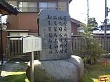 {右}井上圓了漢詩碑・「明治天皇聖蹟」碑 本陣建物隣。手前に平成13年建立の漢詩碑、説明立札、奥に昭和3年建立の聖蹟碑。明治天皇は明治元年(1868)9月22日に土山本陣に1泊した。この時に即位後最初の誕生日を迎え次の日には本陣にて祝賀式(第1回天長節)が挙行され土山の住民全戸に神酒と鯣が下賜された。漢詩碑は私立哲学館(現:東洋大学)創立者で仏教哲学者・井上圓了が大正3年(1914)にこの地を訪れた際にその話を聞き詠んだもの。「鈴鹿山西古驛亭 秋風一夜鳳輿停 維新正是天長節 恩賜酒殽今当賀」とある。明治天皇は同年12月20日と明治2年3月9日にも休憩で立寄った。明治天皇誕生日は明治6年の太陽暦採用により11月3日となり昭和21年の日本国憲法公布日にもなったため現在は文化の日となっている。 |