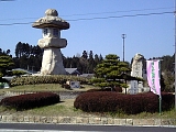 {右・寄}平成万人灯 少し先右に平成3年「中嶋屋」石柱を過ぎると県道539号線(一の松通り)に出る。東海道は直進だが右折してしばらく進み国道1号と交差する土山支所前交差点を渡った左の緑地にある。平成3年に交通事故防止の願いを込めてふるさと創生資金で建てられた。岐阜県中津川市蛭川産の白錆御影石で造られ基礎上の高さ9.33m重さ156.8tで自然石の石灯籠では福岡県八女市の八女伝統工芸館の八女石灯籠(高さ10.5m重さ108.8t)に並び国内最大級。自然石でない灯籠では岡山県岡山市の吉備津彦神社に高さ11.5mのがある。万人灯前には広重の土山宿の絵の石碑、右には「平成万人灯」文字碑、説明碑、左には「あいの土山」文字碑がある。緑地の国道側には「土山町一級基準点」石柱もある。 |