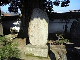 {左・寄}芭蕉句碑 常明寺境内右の木の下にある。建立年不明で自然石に「さみだれに 鳰(にお)のうき巣を 見にゆかむ」とある。寺の15世松堂慧喬(虚白)と親交があった俳人・桜井梅室の揮毫。貞享4年(1687)芭蕉44歳の時の句で自選句集「あつめ句」に収録されており江戸の庵で五月雨の音を聞き琵琶湖への思いを詠んだ。春から夏にかけて葦や水草の葉を使って浮き巣を作る鳰(カイツブリ)が多く生息していた琵琶湖は「鳰の海」とも呼ばれていた。他に境内右には昭和30年鋳造の梵鐘がある鐘楼、昭和52年水子地蔵、稲荷など5柱を祀る小祠、観音銅像もある。 |