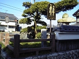 {左}土山陣屋跡 少し先右の平成3年「古め屋」石柱がある民家の斜め向かいの民家前に昭和56年建立の「土山宿陣屋」石柱がある。土山宿は天領であり派遣された代官・猪飼次郎兵衛(治郎兵衛)ら役人の詰所、住居として天和3年(1683)に建てられた。瀬古川の東崖にあり東西25間(45m)南北30間(55m)の規模だった。後に代官は宝永3年(1706)多羅尾四郎右衛門、明和8年(1771)岩出甚右衛門に引き継がれ天明2年(1782)から明治までは再び多羅尾氏になった。その先で吉川を平成12年竣工の大黒橋で渡る。来見橋と同様で白塀、瓦屋根付の欄干には街道風景の切絵計6枚と鈴鹿馬子唄「鈴鹿山には 霞がかかる 可愛い娘にや 目がかかる」「坂は照るるてる 鈴鹿は曇る あいの土山 雨が降る」の陶板が両側にある。 |