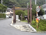 {右}東見附(江戸口)跡 東海道を少し進み坂を上がると右から秋葉神社前からの道が合流する三角地点のポケットパークにある。門柱に「東海道水口宿」木製看板とある冠木門、奥には小さい松、地蔵の祠、石ベンチ、説明碑があるベンチ背後には観光案内パンフが入ったボックスもある。江戸口はそれまで野洲川に沿っていた古東海道が慶長10年(1605)に現ルートになったためここに定められた。天和2年(1682)水口藩成立以降は城下にもなったため宿入口は厳重な警備施設となり享保年間(1716-36)作成の水口宿色絵図や寛政9年(1797)刊行の伊勢参宮名所図会には桝形土居、木戸、番所が描かれている。冠木門左には「中畑へ一リ」と刻まれた石柱もあり右折して行くと現在の水口町中畑に通じる。 |