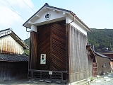 {右}(北道)湯屋町 曳山蔵 北道を進むと少し先にある。向かいには「湯屋町」石柱と昭和41年建立の石祠もある。蔵内には昭和60年県指定無形文化財の水口曳山祭で使用する湯屋町の曳山(全長3.9m幅2.55m高さ5m)が格納されている。水口の曳山は享保20年(1735)に9基の曳山が巡行したのが起こりで後に1町ごとに建造され最盛期には30基余りがあった。現在は16基あり全て市指定文化財で1基は1年交替で水口歴史民俗資料館(水口町水口5638)に展示され他は各町内の曳山蔵にある。2層露天式人形屋台という構造で巡行時は屋上に毎回趣向を変えた飾り物「ダシ」をのせ出来栄えも競う。巡行するのは16基のうち毎年選ばれた5〜8基ほどで他の町は纏田楽を巡行する。少し進むと右に石祠、左に「瀧町」石柱がある。 |