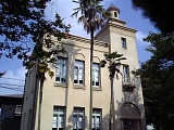 {右・寄}(北道)旧:水口図書館 水口町本町1-2-1 すぐ先の十字路を右折すると正面の水口小学校の正門左にある。明治14年(1881)水口に生まれ大阪で金物商(現:井上鋲螺工業)として成功した実業家・井上好三郎が昭和3年(1928)故郷のために寄贈した旧:水口町立水口図書館の建物。アメリカ人建築家ウィリアム・メレル・ヴォーリズの設計でトスカナ式円柱を配した玄関ドア上には燭台と本とオリーブの葉がデザインされている。建築面積52平方mで鉄筋コンクリート(1部レンガ造)2階建で塔屋付。昭和45年から平成14年までは水口教科書センターとして利用された。平成13年国登録有形文化財で平成16年保存改修され塔屋上のランタンも復元された。現在はコンサート、展示会への利用や毎月第2,4日曜の10時-16時には内部公開(無料)されている。 |