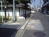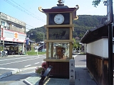 三筋の辻広場(3つの東海道合流点) 北道、中道、南道の3道はここで合流する。中道と南道の合流点の間にはからくり時計があり毎日4回(9時、正午、15時、18時)に時計の脇や下から人形が出てくる。時計土台部分には「東海道水口宿」プレートと広重の水口宿の絵の銅板がある。時計の南道側には若い松。中道側には「宿場町の水口」説明碑、その左には小祠、自然石の常夜燈もある。この先も水口城天王口跡までは中道から続く米屋町商店街となる。 |