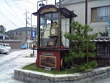 {右}(中道)水口曳山からくり時計 その先の交差点に出るとある。水口曳山をデザインしたからくり時計で毎日4回(9時、正午、15時、18時)曳山を引く人形が動く。横には「曳山の由来」説明碑、「大池町」石柱。交差点を渡って3軒先右に明治33年(1900)創業の和菓子屋長田屋(本町1-7-7)があり五十三次、水口ばやし、五万石などの郷土菓子を売る。その隣は明治25年(1892)創業の笑四季酒造で斜め向かいに「柳町」石柱。少し先向かいに小祠があり少し先右の前野昭雄税理士事務所(本町1-7-15)先の十字路で本町商店街に入る。右に「夷町」「伴町」石柱を過ぎさらに先右の「平町」石柱を過ぎると道がタイル張りの米屋町商店街となりその先左の「米屋町」石柱と小祠を過ぎると少し先が三筋の辻広場。 |