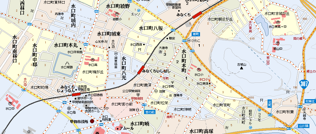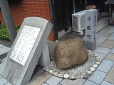 {右}水口石 東海道に戻り十字路を渡り少し先の突き当たりで左折すると右にオレンジの鉄柵がある稲荷神社。東海道はその先で右折する。右折する角に水口石と呼ばれる直径80cmの力石と説明碑、「小坂町」石柱がある。江戸時代の小坂町の角には大きな石があったと伝わり歌川国芳も東海道五十三對で描いている。この辺りは水口城本丸北の二之丸に置かれた水口藩藩庁にも近く百間屋敷(武家屋敷)や小坂町御門などもあった。右折し少し行った先左には第20区遊園地(小公園)があり稲荷神社、「北邸町」石柱、北邸町集会所、ブランコ、鉄棒などの遊具がある。 |
