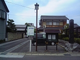 {左}(中道)問屋場跡 高札場から左の道をしばらく行くと2叉路があり右が中道。少し進むと右に「旅籠町」石柱、旅籠町曳山蔵と「曳山蔵」説明立札がある。その先をしばらく行くと十字路があり手前右には「葛籠町」石柱、小祠、松などがある。十字路を渡った左に問屋場の説明碑がある。碑の周りは車道を含め色タイルが敷かれている。水口宿の問屋場は何度か移転したが江戸中期以降は現在位置に定まった。向かいには文政年間(1818-29)創業の和菓子屋一味屋(京町5-18)があり古城山、ひき山、本陣羊羹などの郷土菓子を売る。この先は本水口商店街となりしばらく行くと右に瓦葺の町家を模した建物(待合所)があり建物の奥は甲賀市コミュニティバスの本水口バス停&ロータリーで小祠もある。 |
