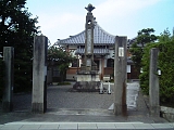 {右}(北道)華園山 本正寺 [日蓮宗] 水口町本町2-3-18 十字路からしばらく行くと左の空地に松、「中之町」石柱、小祠、石仏5基があり少し先にある。天正5年(1577)量詮院日祐が創建。入口左に題目塔、右に寺名碑。山門前右には日蓮銅像がある。天保3年(1832)10世中心院日遍が本堂と庫裏を改修。慶応2年(1866)水口藩主・加藤明実が帰依し藩主祈願所となり開運殿妙見堂を建立した。明実の3番目の妻・慶姫の父は陸奥国八戸藩主・南部信順で熱心な日蓮宗信者だった。現在の本堂は昭和57年23世龍興院日正の再建で境内右にある現在の妙見堂は平成元年の再建。本堂左の書院は平成15年、本堂右の庫裏は平成18年の築。境内には盆栽が数多く並ぶ。 |