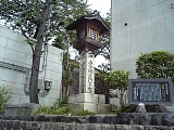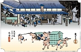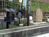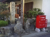 {左}三度飛脚取次処・荒物屋九右衛門跡(現:中神医院) 草津2-10-26 少し先。前が駐車場スペースになっているビル風の建物前。排水溝にプレートがある。月に3度東海道を往復したという三度飛脚の取次処。三度飛脚は江戸大坂間を毎月3回往復した飛脚で公用の継飛脚、諸藩専用の大名飛脚と違い一般人も利用できた。プレートには広重の行書版東海道の赤坂宿の絵が転写され「三度飛脚取次処 荒物屋九右衛門家跡」とある。中神医院は江戸後期の京都の漢方医・中神琴渓の子孫の経営。平成5年に没した郷土史家、美術品収集家でもあった医師・中神良太の浮世絵、絵画コレクションは中神コレクションとして草津宿街道交流館に所蔵されている。 |