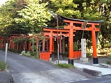 {左}稲荷神社 矢倉2-7-36 少し先を右折した左に小さな愛宕神社。さらに東海道を進むと左に白塗双体地蔵2体の小祠がある。少し先で左側に歩道が付き道幅が広くなり少し行くと右に白塗1体の小祠。さらに進むと稲荷神社がある。創建時期は不明だが元禄3年(1690)東海道分間絵図には記載がある。祭神は倉稲魂命。入口一番前の赤鳥居は平成21年。その後ろ右に昭和52年神社名石柱。参道には昭和後期から平成の赤鳥居が30基近く並び途中に昭和63年狛狐。参道を進み直進すると裏入口、その手前右に手水石、手前を左折すると覆屋下に天皇朝日大明神と伊吹大明神の社殿が並ぶ。社殿前の狛狐と赤鳥居も昭和63年建立。裏入口には昭和59年神社名石柱。東海道は少し先の矢倉南交差点で国道1号とX状交差する。 |