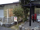 {左}書状集箱・堯孝法師の歌碑 公民館前の街道沿いにある。書状集箱は明治4年(1871)郵便創業当時使用していたものと同じ型のもので現役ポストとして使用されており横に平成10年設置の説明立札がある。平成3年建立の歌碑は「近江路や 秋の草つは なのみして 花咲くのべぞ 何處ともなき」とあり覧富士記に収録。室町時代の歌人・堯孝(尭孝)が永享4年(1432)室町幕府6代将軍・足利義教の供で富士山を見に行く途中に草津で詠んだもの。草花が咲く美しい野を思い描いていたのにそうではなく草津とは名ばかりと思ったという意味。堯孝は和歌四天王の一人・頓阿の曽孫で常光院とも号し二条派の中心歌人だった。歌碑の先には「草津歴史街道・東海道」説明板、平成10年鈴木典明作のモニュメント「時の旅人」もある。 |