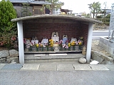 {右}子守地蔵 新しい住居が並ぶ広い道になると少し先。平行する2本の道に挟まれた敷地に煉瓦祠が東海道に背を向けてあり中に白塗石仏が5体ある。参勤交代で江戸に向かう肥後国の大名が通った際に列の邪魔をしたとして斬殺された母子の供養のため里人が双体地蔵を安置したのが起こりで「子供を守る子守地蔵」と呼ばれ信仰を集めた。兜虫を捕ろうと飛び出した4歳の男児が侍にぶつかったため斬られたと伝わる。翌年斬った侍が江戸から戻る途中に地蔵を見つけ十禅寺川に投げ捨てたが里人が拾い再び祀ったとも言う。白塗の地蔵は他にも草津周辺に広く分布し野路には130体以上あり毎年8月24日(地蔵盆)には近隣の子供達が地蔵に石膏を塗り顔を描く風習がある。少し先には庭園風の敷地に小祠2つある。 |