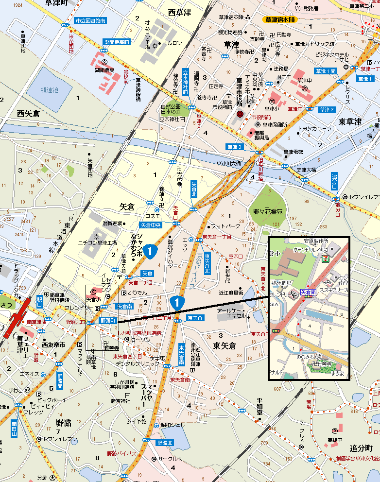 {左}藤屋与(與)左衛門脇本陣跡 すぐ先の十字路渡った民家前の排水溝にプレートがある。寛政年間(1789-1800)以前から幕末まで脇本陣で庄屋、問屋役もつとめていた。プレートには元禄3年(1690)東海道分間絵図の草津付近の図が転写され「脇本陣 藤屋与左衛門家跡」とある。脇本陣は他に大黒屋弥助、仙台屋茂八、柏屋十(重)右衛門、平井屋彦右衛門らが時代によりつとめ常時2〜4軒があった。手前には白塗石仏の小祠もある。隣の明治40年(1907)創業の茶販売・吉川芳樹園(草津2-7-33)の店舗兼主屋は昭和50年に改造されいるが江戸末期の築で平成19年国登録文化財。瓦葺木造平屋1部3階建で1階屋根の出桁を白漆喰で塗込め2階には虫籠窓。斜め向かいには明治30年創業の和ろうそく店・大喜(草津2-5-11)もある。 |