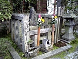 {左}木曽塚 境内のほぼ中央にある。義仲の墓(供養塔)で土壇の上に宝篋印塔があり木曽塚とも呼ばれる。手前には小さな長方形石に「巴塚」と刻まれた巴塚があり説明立札もある。平家物語では巴は義仲と共に粟津で戦い敵将恩田八郎師重を討ち取ったが義仲の言葉で落ち延びたと言う。その後は尼僧となり各地を廻り晩年は木曽に戻り90歳で没したとされる。さに手前の境内左には昭和48年に秋岸寺跡(現:JR大津駅前)から移された山吹塚もある。山吹は巴と共に信濃から義仲に従ってきた妾で義仲討死時は京で病の養生をしていた。義仲を追ってきたが会えずに秋岸寺で敵刃に倒れたとも義仲の遺骸を葬った後に井戸に身を投げたとも伝わる。境内には天保3年(1832)「朝日将軍木曽源公遺跡之碑」もある。 |