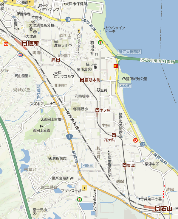 京阪電鉄 瓦ヶ浜駅 すぐ先の瓦ヶ浜踏切で再び京阪電鉄石山坂本線を越える。踏切の左右に駅があり手前右と渡った左がホームとなっている。大正2年(1913)大津電車軌道の駅として開業。昭和2年(1927)琵琶湖鉄道汽船の駅となり昭和4年京阪の駅となった。戦時中は京阪神急行電鉄(現:阪急電鉄)の駅となり一時的に営業休止したが戦後に再開し昭和24年再び京阪の駅となった。越えてすぐ右折し80m先右には膳所焼美術館(中庄1-22-28)がある。膳所焼は江戸初期に膳所藩の御用窯だった勢田焼を前身として小堀遠州の指導で確立し国焼「遠州七窯」の1つになっている。広くは地元の梅林焼や雀ヶ谷焼、大正8年(1919)再興の復興膳所焼も含む総称となっている。 |