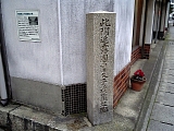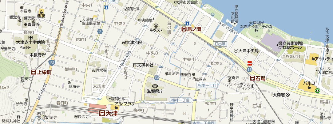 札の辻 少し先の京町一丁目交差点で国道161号に出る。ここが札の辻で北国街道との分岐だった。渡った左角の株式会社セレマ大津テレフォン支所(札の辻6-22)前に昭和56年「札の辻」茶色説明柱、「辻の札の由来」説明付き付近案内地図、大津市道路元標がある。江戸時代はここに高札場、人馬会所、馬神社もあり明治に入り中央小学校(島の関1-60)の前身である日新学校が建てられた。校舎は明治22年(1889)に町役場となり明治31年市制施行から市役所庁舎として大正5年(1916)まで利用された。馬神社は校舎建築時以降場所を転々とし現在は長等神社(三井寺町4-1)の境内社となっている。東海道は左折し逢坂山関址までゆるやかな坂を上る。道路中央には路面電車の京阪電鉄京津線も走る。 |