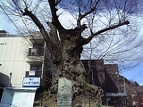{右・寄}犬塚の欅 本長寺門前を右に進み大津赤十字病院(長等1-1-35)に突き当たって左折していくと右にある。本長寺墓地の塀と道路を隔てた裏手。高さ10m樹齢600年で昭和40年市指定天然記念物。欅の前には「犬塚」石碑がある。顕証寺を創建した本願寺8世蓮如の膳に毒が盛られたが愛犬が先に食べ身代わりに死んだため蓮如が墓を建て欅を植えたと伝わる。蓮如は寛正6年(1465)の寛正の法難以後比叡山延暦寺の門徒に追われ近江を転々としており応仁3年(1469)逃亡先の夕陽山本福寺(本堅田1-22-30)から大津に移り住み文明3年(1471)には越前の吉崎御坊へ移った。 |