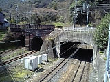 {右}蝉丸(上関寺)跨線橋 すぐ先に陸橋がありJR東海道本線の線路を渡る。右を見ると東海道本線の4本の線路はすぐ京阪電鉄京津線の跨線橋をくぐっている。大正元年(1912)京津電気軌道(現:京阪電鉄京津線)が開通した2年後の大正3年に東海道本線の逢坂山トンネル(長さ2325m)が着工したため東海道本線が京津電気軌道の下を掘り下げてくぐることになり跨線橋が造られた。左側の2線はレンガ造りで大正10年(1921)京津電気軌道跨線拱橋として背後の逢坂山トンネルと共に完成したもの。右の2線は内側が昭和16年(1941)着工し昭和19年に完成し外側が昭和40年着工し昭和45年に完成した。 |