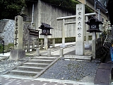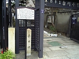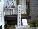 {左}坂本龍馬 お龍「結婚式場」跡 五軒町112 少し先の東山ユースホステル前に平成21年建立の石柱と説明碑、背後のガラスに2人の写真がある。2人の結婚には諸説あるが明治32年(1899)頃に元海援隊士・安岡金馬の3男・秀峰がお龍から聞き取りまとめた回想録「反魂香」によると元治元年(1864)青蓮院の塔頭・金蔵寺本堂にて住職・智息院の媒酌により30歳の坂本龍馬と24歳の楢崎龍は祝言を挙げた。龍の亡き父・将作が青蓮院宮の侍医だったことがこの地を選んだことに関係するとされている。明治になって廃仏毀釈により金蔵寺は廃寺となったがこの付近から南が寺跡にあたる。東山ユースホステルは平成23年に廃業し跡地にはマンションが建設予定。向かいのローソン東山三条店(五軒町113)がある建物左前には石仏の小祠もある。 |